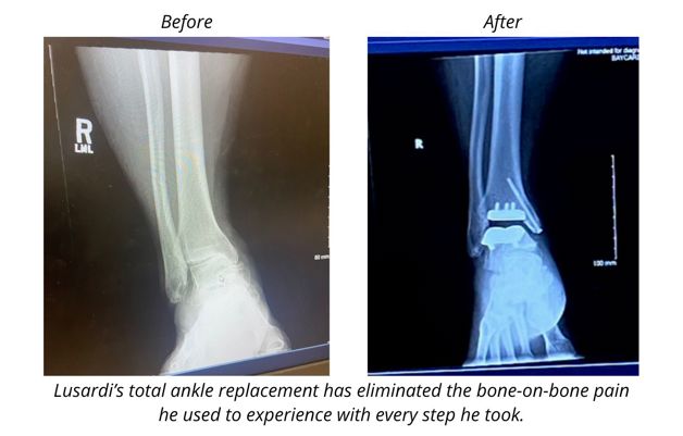 Scharer also replaced Lusardi’s left ankle in December 2020. Years of playing football, basketball, and racquetball had taken their toll. Lusardi had a ligament reconstruction 18 years ago and was getting joint injections regularly to manage the pain. But even with most of that activity in his past, Lusardi’s ankles weren’t holding up daily.